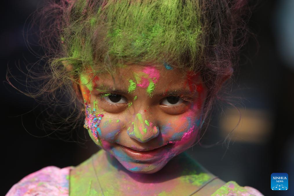 A girl smeared with colored powder is pictured during the celebration of Holi festival in Pattaya, Thailand, March 13, 2026. (Xinhua/Rachen Sageamsak)