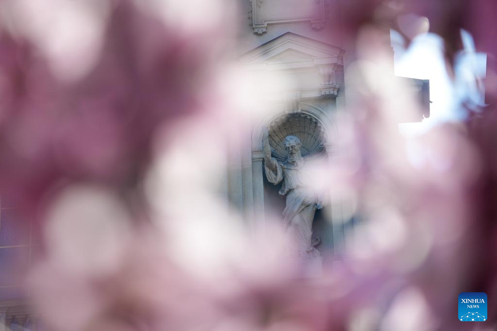 A statue is seen through magnolia blossoms in Milan, Italy, March 13, 2026. (Xinhua/Li Jing)