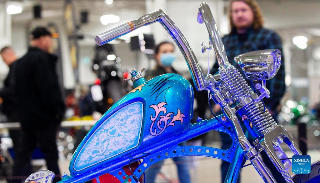 People look at customized motorcycles during the 2022 North American International Motorcycle Supershow in Mississauga, the Greater Toronto Area, Canada, on March 25, 2022. The three-day event kicked off here on Friday with hundreds of different models of motorcycles. (Photo by Zou Zheng/Xinhua)