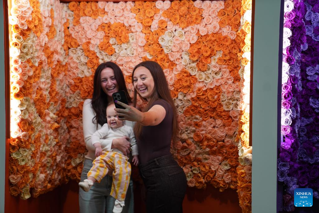 People take a selfie in front of flowers at the Philadelphia Flower Show in Philadelphia, the United States, March 8, 2026. (Xinhua/Zhang Fengguo)