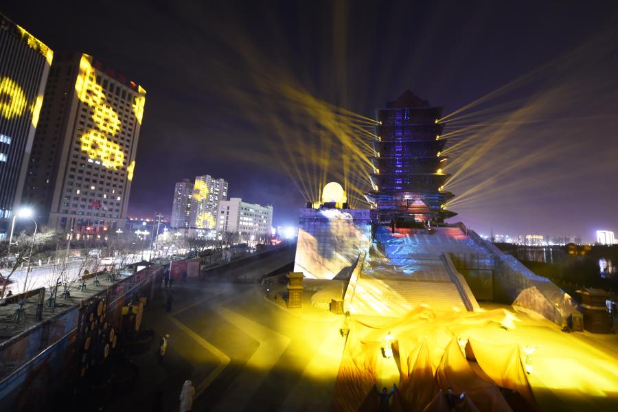 ??? 這是1月3日在蘭州黃河樓景區(qū)拍攝的《大有蘭州》光影秀。