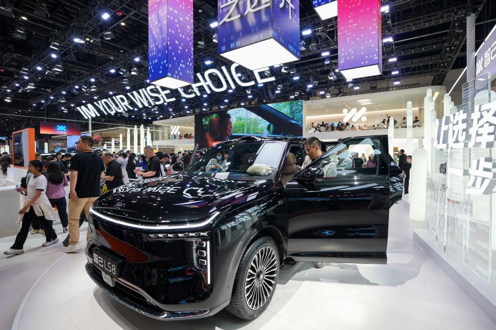 4月26日,在2026北京车展上,参观者在智己公司展台参观智己LS8。