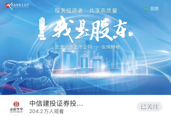 为深化投资者与上市公司的良性互动,助力投资者洞悉企业价值,持续讲好沪市上市公司高质量发展故事,响应上交所“我是股东”走进沪市上市公司活动,2025年11月19日,由中信建投证券宜昌云集路证券营业部组织开展“走进沪市上市公司--安琪酵母”现场活动,本次活动共有25名投资者参与,同时本次活动2025年12月9日同步在新华网线上直播,直播观看人数超200万。