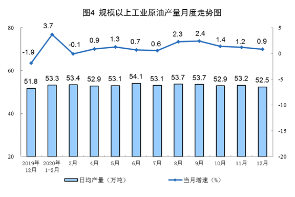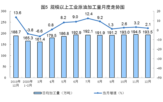 原油生產(chǎn)增速略有放緩。12月份,生產(chǎn)原油1627萬噸,同比增長(zhǎng)0.9%,增速比上月回落0.3個(gè)百分點(diǎn);日產(chǎn)52.5萬噸,環(huán)比減少0.7萬噸。加工原油6000萬噸,同比增長(zhǎng)2.1%,比上月回落1.1個(gè)百分點(diǎn)。2020年,生產(chǎn)原油1.95億噸,比上年增長(zhǎng)1.6%;加工原油6.7億噸,增長(zhǎng)3.0%。