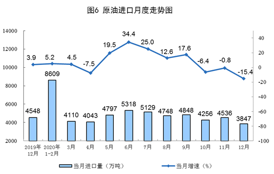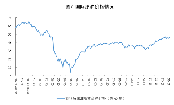 原油進(jìn)口降幅擴(kuò)大,國(guó)際原油價(jià)格繼續(xù)上漲。進(jìn)口原油3847萬噸,環(huán)比減少689萬噸,同比下降15.4%,降幅比上月擴(kuò)大14.6個(gè)百分點(diǎn);2020年,進(jìn)口原油5.4億噸,比上年增長(zhǎng)7.3%。12月31日,布倫特原油現(xiàn)貨離岸價(jià)格為51.22美元/桶,比11月30日的46.84美元/桶上漲9.4%。