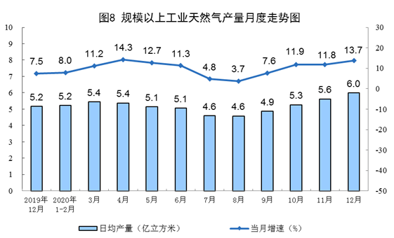 天然氣生產(chǎn)持續(xù)快速增長(zhǎng)。12月份,生產(chǎn)天然氣187億立方米,同比增長(zhǎng)13.7%,增速比上月加快1.9個(gè)百分點(diǎn);日產(chǎn)6.0億立方米,環(huán)比增加0.4億立方米。2020年,生產(chǎn)天然氣1888億立方米,比上年增長(zhǎng)9.8%,連續(xù)四年增產(chǎn)超過100億立方米。