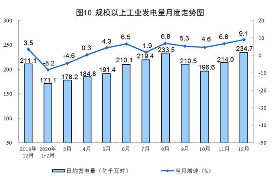 電力生產(chǎn)增速繼續(xù)加快。12月份,發(fā)電量7277億千瓦時(shí),同比增長(zhǎng)9.1%,增速比上月加快2.3個(gè)百分點(diǎn);日均發(fā)電234.7億千瓦時(shí),環(huán)比增加20.7億千瓦時(shí)。2020年,發(fā)電量74170億千瓦時(shí),比上年增長(zhǎng)2.7%。
