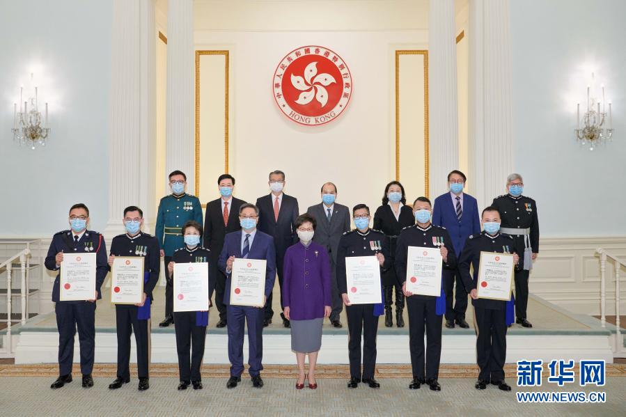 2月10日,香港特區(qū)行政長官林鄭月娥向7名現(xiàn)任和前任警務(wù)處高級警務(wù)人員頒發(fā)行政長官公共服務(wù)獎(jiǎng)狀,以表彰他們?yōu)榫S護(hù)國家安全作出的重大貢獻(xiàn)。新華社發(fā)