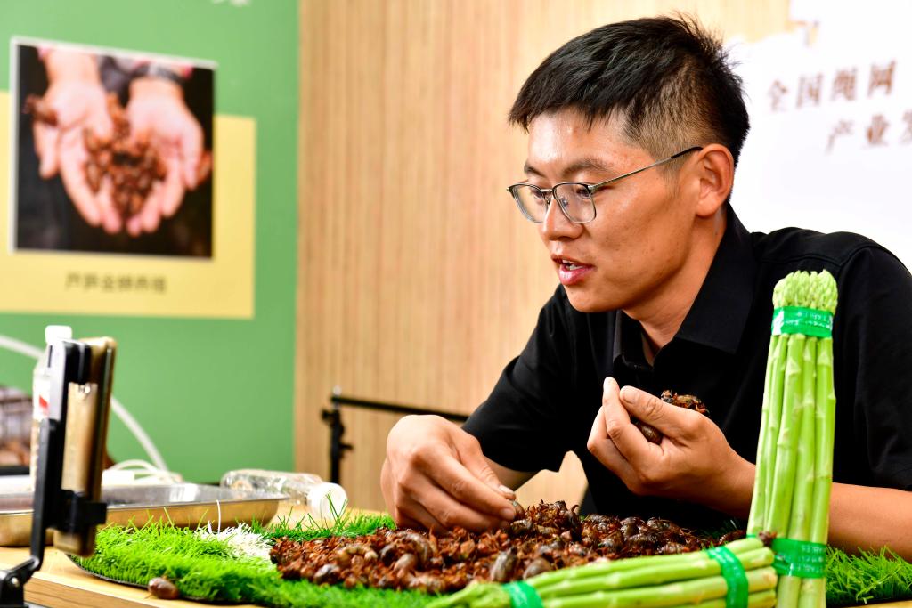 6月26日,网络主播在惠民县姜楼镇共享直播间推介知了猴。