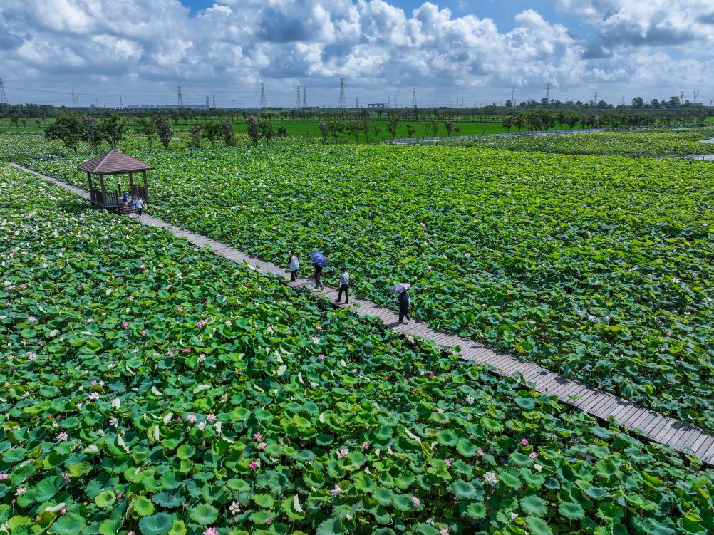 7月23日,游客在海宁市海昌街道双山村的“武莲海种”荷花基地赏荷(无人机照片)。