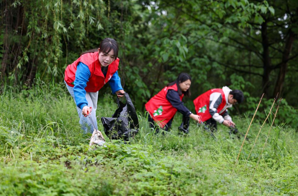 4月22日,青年志愿者在贵州省铜仁市玉屏侗族自治县㵲阳河沿岸捡拾垃圾。