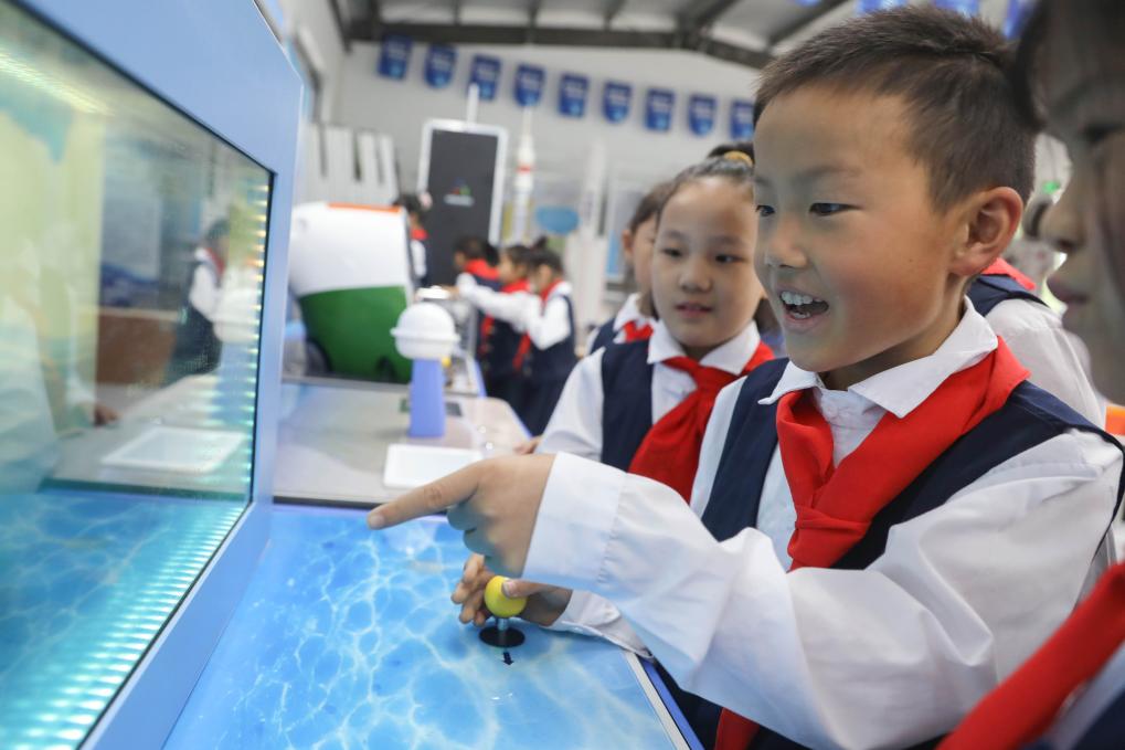 4月21日,河南省平顶山市宝丰县山河路小学学生在体验“传声探海”。