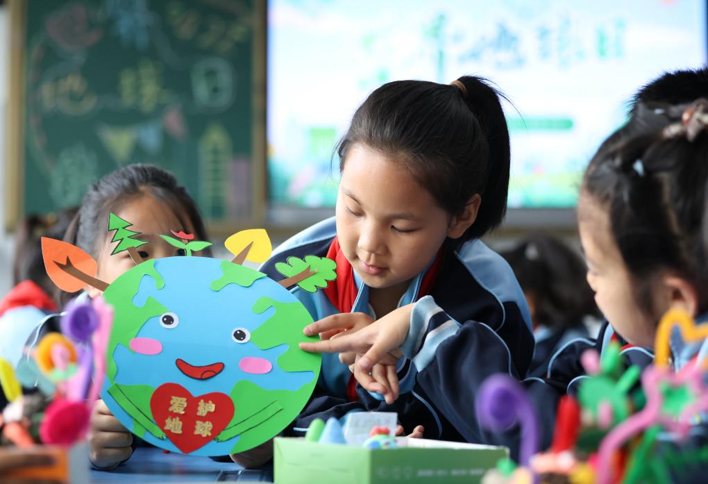 4月22日,在江苏省泰州市姜堰区康华小学,老师给学生讲解保护地球的相关知识。