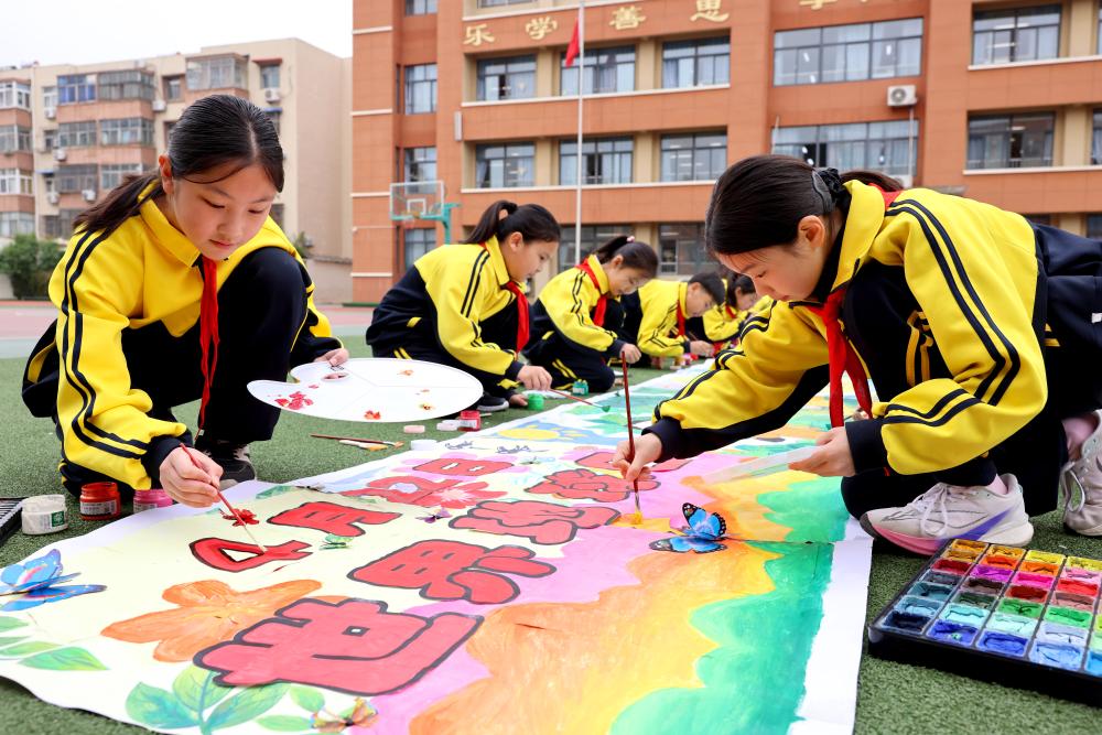 4月21日,山东省枣庄市市中区光明路小学学生在绘制“珍爱地球 守护美丽家园”画卷。