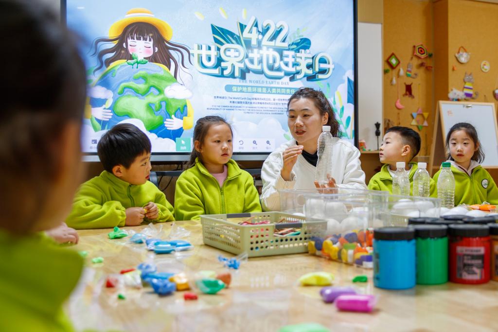 4月22日,在贵州省黔东南苗族侗族自治州施秉县第四幼儿园,老师指导孩子们制作以地球为主题的手工作品。
