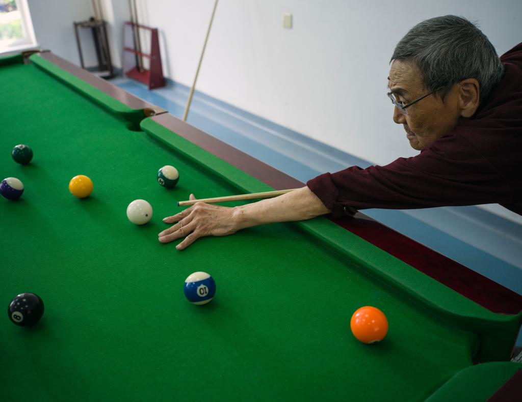 4月23日,老人在天津市滨海新区第一老年养护院打台球。
