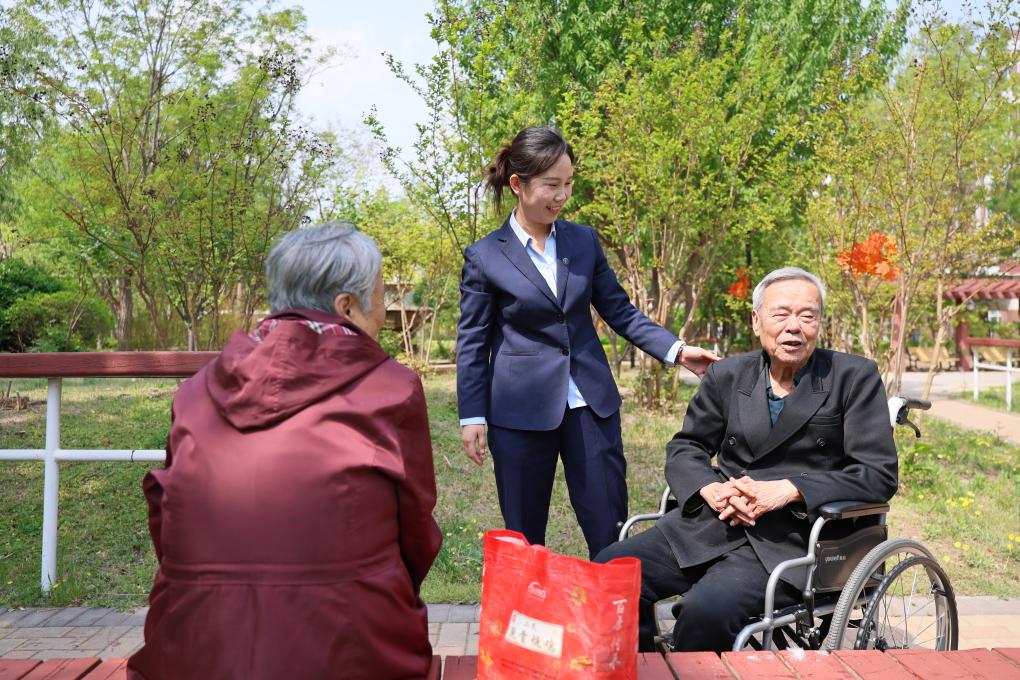 4月23日,在天津市滨海新区第一老年养护院,工作人员陪老人聊天。
