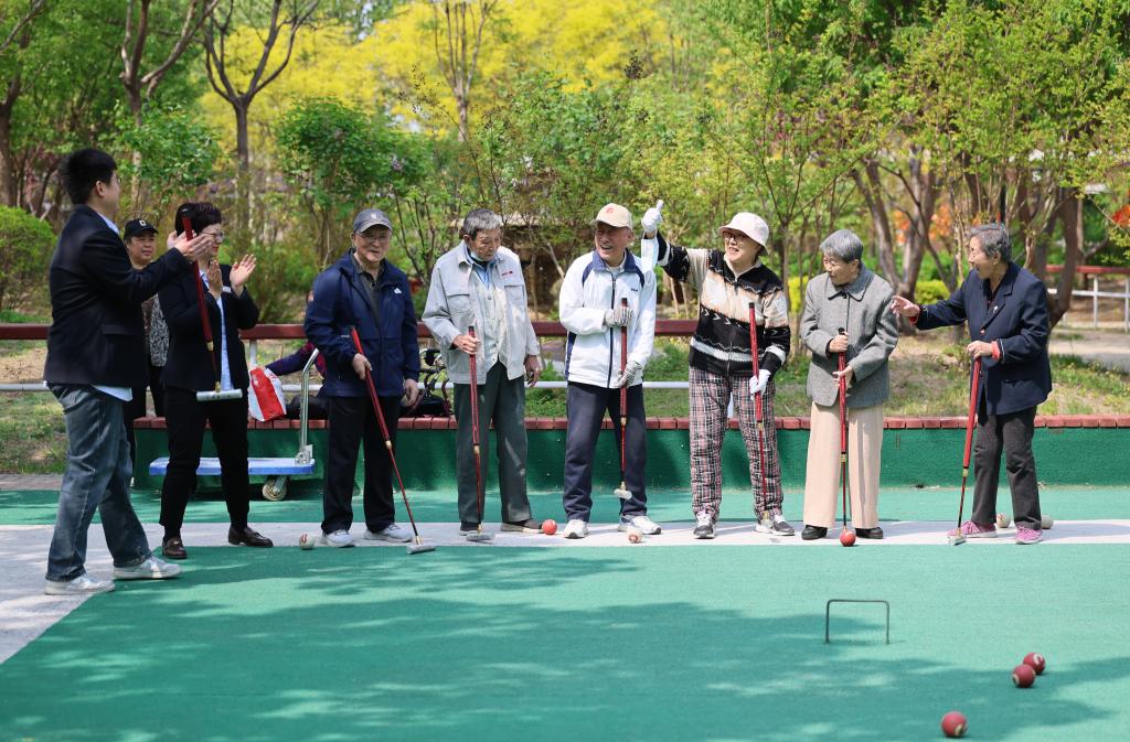4月23日,老人在天津市滨海新区第一老年养护院内打门球。