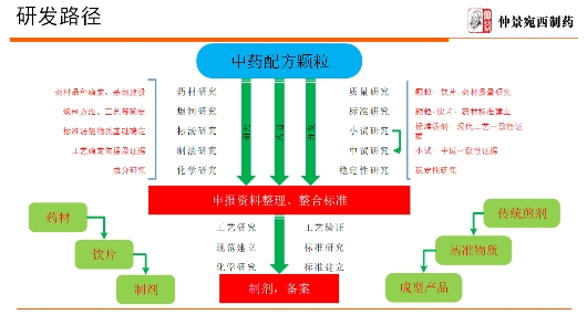 中藥配方顆粒的研制路線是從產(chǎn)品研制開始,要經(jīng)過標(biāo)準(zhǔn)復(fù)核、現(xiàn)場(chǎng)檢查、專家評(píng)審等環(huán)節(jié),最終需獲得藥監(jiān)管理部門的備案許可。研制路徑的重點(diǎn)主要是前期大量文獻(xiàn)的調(diào)研、過程中質(zhì)量控制的一致性研究和工藝的穩(wěn)定性、有效性再評(píng)價(jià)等,對(duì)企業(yè)的研發(fā)、人才及經(jīng)濟(jì)方面的投入要求非常高。