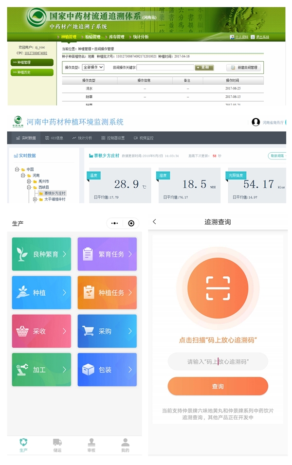 依托國(guó)家中藥材流通追溯體系、河南中藥材種植環(huán)境監(jiān)測(cè)系統(tǒng)、宛西制藥ERP信息系統(tǒng),企業(yè)建成中藥材及中成藥生產(chǎn)流通可追溯體系,實(shí)現(xiàn)從基地藥材、中藥飲片、生產(chǎn)過程、質(zhì)量檢測(cè)、市場(chǎng)流通全流程的業(yè)務(wù)管理和質(zhì)量溯源管理。通過機(jī)制創(chuàng)新、優(yōu)化流程,實(shí)現(xiàn)統(tǒng)一管理,滿足強(qiáng)化企業(yè)質(zhì)量管控。