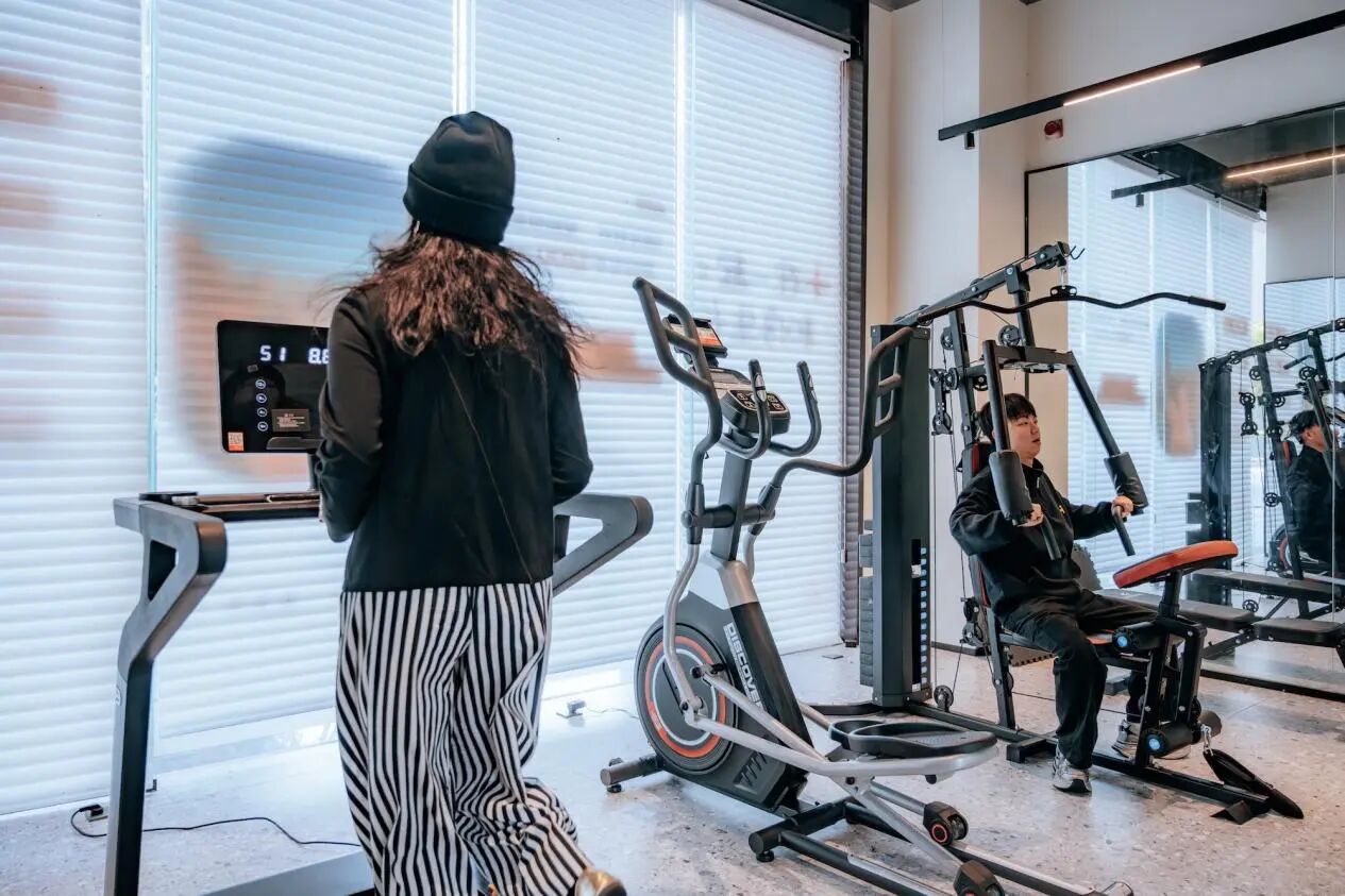 这里缘何能吸引年轻人入住?走进公寓大堂,几对租客坐在桌边聊天,走廊通向电梯,也连接着公寓自己运营的洗衣房、台球室和健身房,外面花园里的篮球场上,两个青年正挥洒着汗水。健身房里,租客小敏正在跑步机上跑步,她和林启盛同样,已是第2年在这里居住。