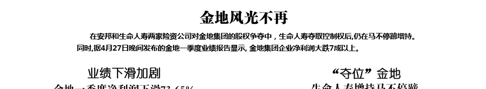 險(xiǎn)資“咄咄逼人” 股權(quán)之爭(zhēng)何時(shí)了? 根據(jù)金融街一季報(bào)顯示,除了第一大股東北京金融街集團(tuán)為國(guó)有法人外,十大股東中的其他均是機(jī)構(gòu)投資者:4家保險(xiǎn)、3家信托和2家基金重倉(cāng)。 4月底和諧健康險(xiǎn)舉牌后,安邦系已經(jīng)成為第二大股東。加上舉牌后的和諧健康險(xiǎn),其余九大股東總共持倉(cāng)為13.45%。其中,安邦保險(xiǎn)子公司和諧健康險(xiǎn)一季度持股金融街5162.6萬(wàn)股,占比1.71%,位列第三大股東。 5月6日,金融街控股股東金融街集團(tuán)及其一致行動(dòng)人增持了公司股份55,000,000股,占公司股份總數(shù)的1.82%。增持后,大股東合計(jì)持有金融街股份總數(shù)的29.74%,逼近30%的收購(gòu)邀約線(xiàn)。 |