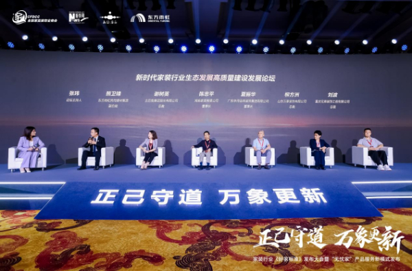 最后,大会进行了“家装行业生态发展高质量建设发展论坛”,参与对话的嘉宾有:东方雨虹民用建材集团副总裁熊卫锋、土巴兔集团股份有限公司总裁谢树英、鸿扬家居有限公司董事长陈忠平、广东华浔品味装饰集团有限公司董事长夏振华、山东万泰装饰有限公司总裁柳方洲以及重庆兄弟装饰工程有限公司总裁刘波。