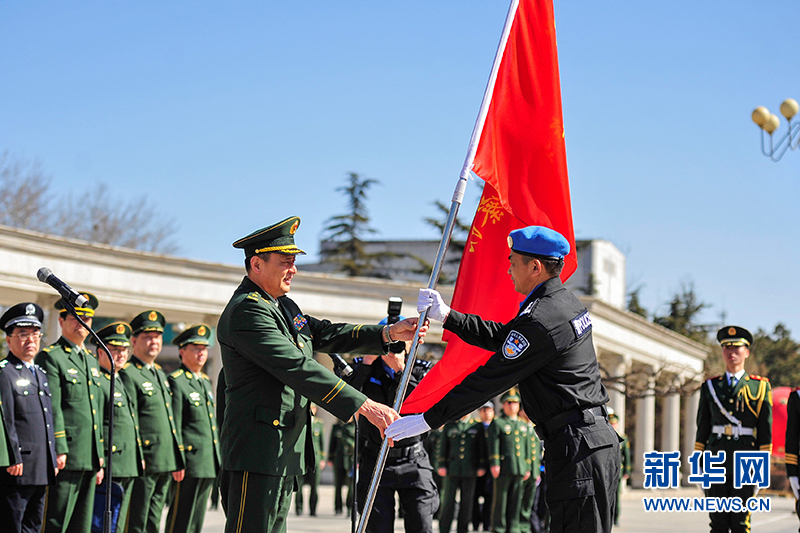 ????10日,中國第四支赴利比里亞維和警察防暴隊在中國維和警察培訓中心舉行出征儀式。公安部邊防管理局局長陳定武為防暴隊授旗并講話。中國人民武裝警察部隊學院院長馬金旗、政委李樂民,公安部邊防管理局副局長徐寬宥,公安部國際合作局副局長徐乃剛,公安部維和警察領導小組成員單位負責人等出席出征儀式,為防暴隊送行。