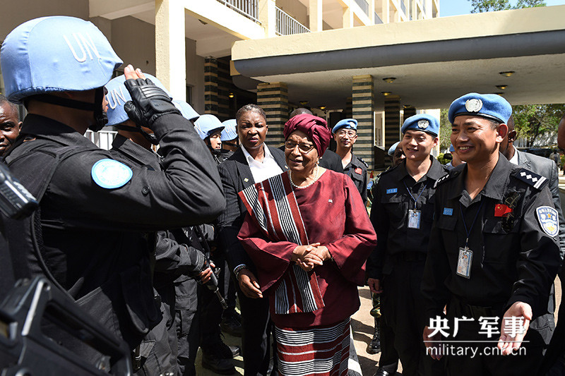 圖為利比里亞總統(tǒng)瑟利夫看望慰問防暴隊(duì)隊(duì)員。(資料圖)