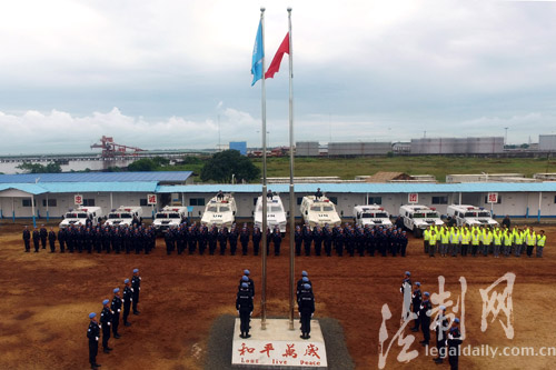 ????利比里亞蒙羅維亞時間9月25日,中國第四支駐利比里亞維和警察防暴隊與駐利比里亞中資企業(yè)員工和華人華僑代表一同舉行“戰(zhàn)地國旗別樣紅”慶祝國慶活動,在中華人民共和國成立67周年來臨之際,在距離祖國一萬三千公里的維和任務(wù)區(qū)向祖國致敬。