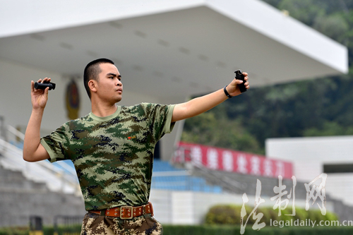 ????練兵場上空被投擲的防暴彈劃出一條條優(yōu)美的弧線?!鞍谁h(huán)、九環(huán)、十環(huán)……。”報靶員響亮的聲音響徹練兵場。班長蔡錦彬投擲的防暴彈仿佛對靶心有向心力,一環(huán)比一環(huán)高;其他官兵也不甘示弱,剛剛創(chuàng)下的好成績不斷被刷新,戰(zhàn)士廖國勇猶如賽場上的一匹黑馬,憑著過硬的實力,一路過關(guān)斬將,奪得第一。(林宇華)