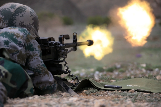 2016年4月25日,西部戰(zhàn)區(qū)陸軍某團(tuán)機(jī)槍連官兵攜帶重機(jī)槍對(duì)“敵”目標(biāo)實(shí)施火力打擊。視覺中國供圖(資料圖片)