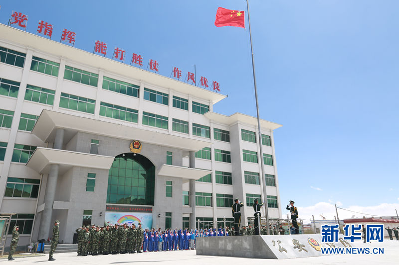 “孔繁森”小學(xué)困難兒童與邊防官兵一同參加升國旗儀式。張拴根 攝
