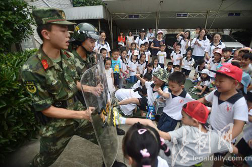 ????8月7日上午,江蘇邊防總隊(duì)揚(yáng)州邊檢站營(yíng)區(qū)內(nèi)傳出一陣陣稚嫩的驚嘆聲和歡呼聲,36名東方劍橋外語(yǔ)幼兒園學(xué)生及家長(zhǎng)一同走進(jìn)邊防部隊(duì)營(yíng)區(qū),與武警叔叔共同感受部隊(duì)的真實(shí)生活。