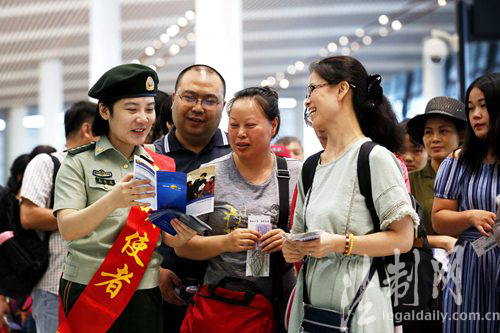 圖為邊檢官兵向出入境旅客普及邊檢知識
