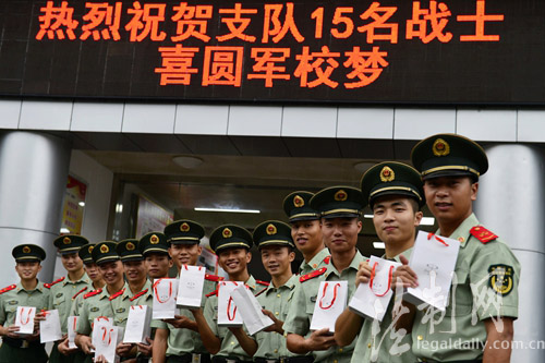 ????昔日禁毒反恐當(dāng)尖兵,今朝題名金榜站排頭!正當(dāng)各地紛紛樂道高考升學(xué)率的同時(shí),南粵邊防警營也傳來喜報(bào)。8月28日,深圳銀湖山訓(xùn)練基地里處處洋溢著喜悅;禁毒尖兵、狙擊手、士官楊平申等來至廣東公安邊防總隊(duì)機(jī)動(dòng)支隊(duì)的15名戰(zhàn)士喜圓軍校夢,被廊坊武警學(xué)院、公安邊防高等??茖W(xué)校等3所部隊(duì)院校錄取,戰(zhàn)友們?yōu)樗麄兣e行簡樸而隆重的歡送儀式。據(jù)悉,連續(xù)多年來,這個(gè)支隊(duì)在廣東邊防總隊(duì)40多個(gè)基層單位中戰(zhàn)士升學(xué)率名列前茅。