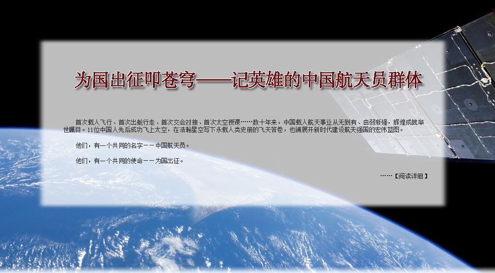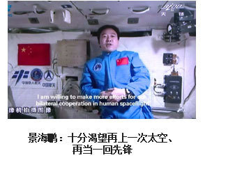 ??? 為了人類的和平與進步,中國人來到了太空。2003年10月15日,我搭乘神舟五號飛船,在太空飛行14圈,歷時21小時23分,完成了中國首次載人航天飛行。雖然是獨自在太空飛行,但一想到億萬祖國人民翹首以待,我覺得不是一個人在飛。于是我拿起太空筆,在工作日志的背面寫上了這樣一句話:“為了人類的和平與進步,中國人來到了太空”,并在艙內鏡頭前向祖國人民、世界人民展示?!盀榱巳祟惖暮推脚c進步”,是中國發(fā)展載人航天事業(yè)的初衷,“中國人來到了太空”既描述了一個歷史時刻,也表達了我為祖國航天事業(yè)感到無比自豪的心情。?