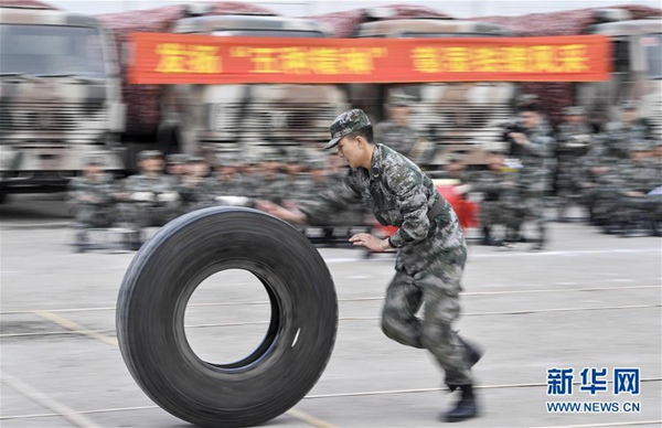 5月6日,沈陽(yáng)聯(lián)勤保障中心某汽車運(yùn)輸旅一營(yíng)戰(zhàn)士在軍體比武上進(jìn)行滾輪胎接力賽。新華社記者 許暢 攝