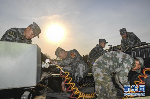 5月9日,沈陽(yáng)聯(lián)勤保障中心某汽車運(yùn)輸旅一營(yíng)戰(zhàn)士對(duì)車輛進(jìn)行維修保養(yǎng)。新華社記者 許暢 攝