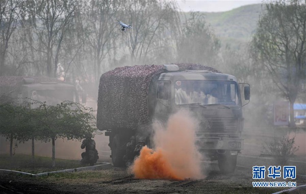 5月6日,沈陽(yáng)聯(lián)勤保障中心某汽車運(yùn)輸旅一營(yíng)戰(zhàn)士進(jìn)行無(wú)人機(jī)處突演練。新華社記者 許暢 攝