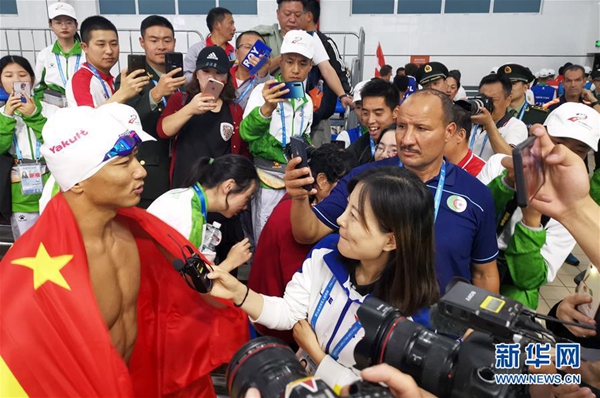 走出泳池,張政成了場上的“明星”,和幾個隊友擁抱擊掌后,便立刻被眾人圍在中間?,F(xiàn)場觀眾和其他運動員紛紛向他表示祝賀,人群中不時有人歡呼著“世界紀錄!世界紀錄!”。隨后,激動的張政披著國旗,在泳池邊跟家人、朋友合影,定格了這難忘的一刻。
