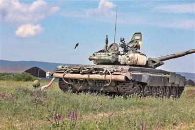 ????為保證訓(xùn)練效果,俄軍專(zhuān)門(mén)調(diào)集多輛T-72B3主戰(zhàn)坦克作為教具。反坦克訓(xùn)練開(kāi)始后,新兵隱藏在挖好的塹壕中,T-72B3坦克從上面駛過(guò),隨后新兵從塹壕中探出身,向坦克尾部投擲反坦克手榴彈。