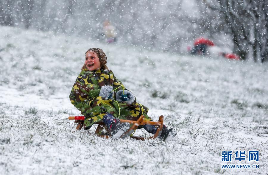 1月24日,一名女孩在英國倫敦的大雪中滑雪橇。新華社記者韓巖攝