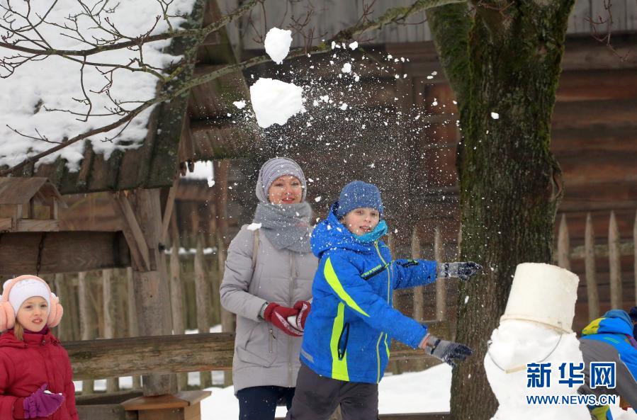 1月24日,孩子們在白俄羅斯首都明斯克郊區(qū)的民族建筑博物館內(nèi)打雪仗。新華社發(fā)(任科夫攝)