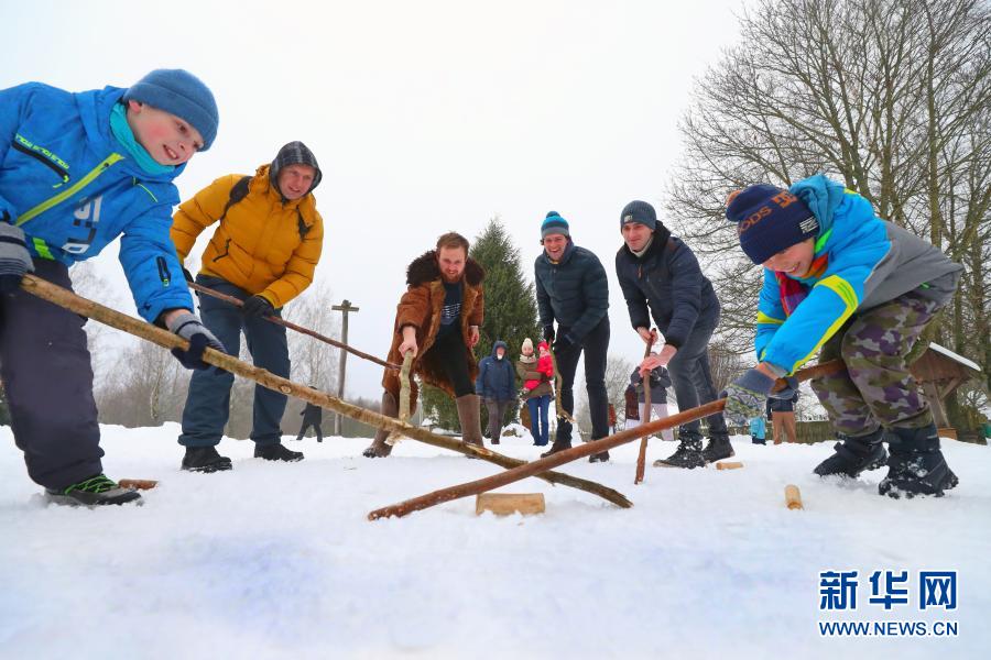 1月24日,人們?cè)诎锥砹_斯首都明斯克郊區(qū)的民族建筑博物館參與傳統(tǒng)的冰雪游戲。新華社發(fā)(任科夫攝)