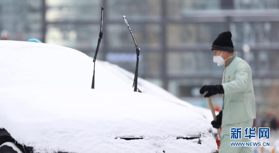 1月28日,在沈陽(yáng)市渾南區(qū),一名工作人員清掃停車場(chǎng)積雪。