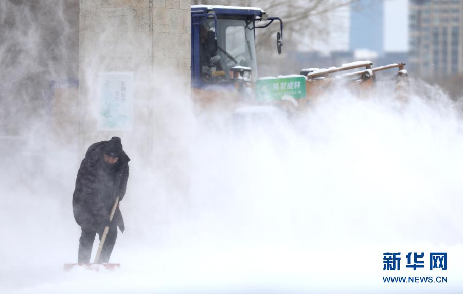 1月28日,工人在沈陽市渾南區(qū)奧林匹克公園清掃積雪。