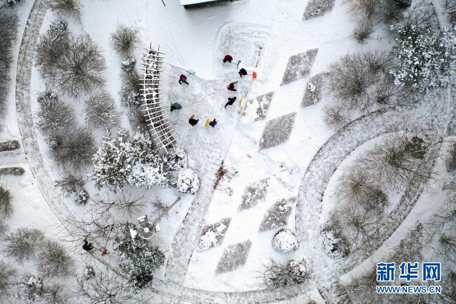 1月28日,在沈陽(yáng)市渾南區(qū),一小區(qū)物業(yè)的工作人員在清掃積雪(無(wú)人機(jī)照片)。