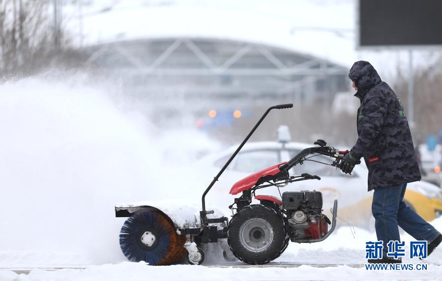 1月28日,在沈陽市渾南區(qū),一位工作人員在奧林匹克公園清掃積雪。