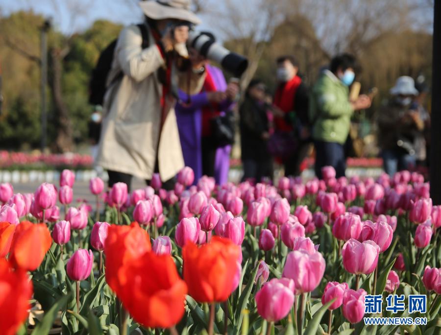 2月14日,游客在昆明市大觀公園拍攝盛開的郁金香。新華社發(fā)(梁志強 攝)